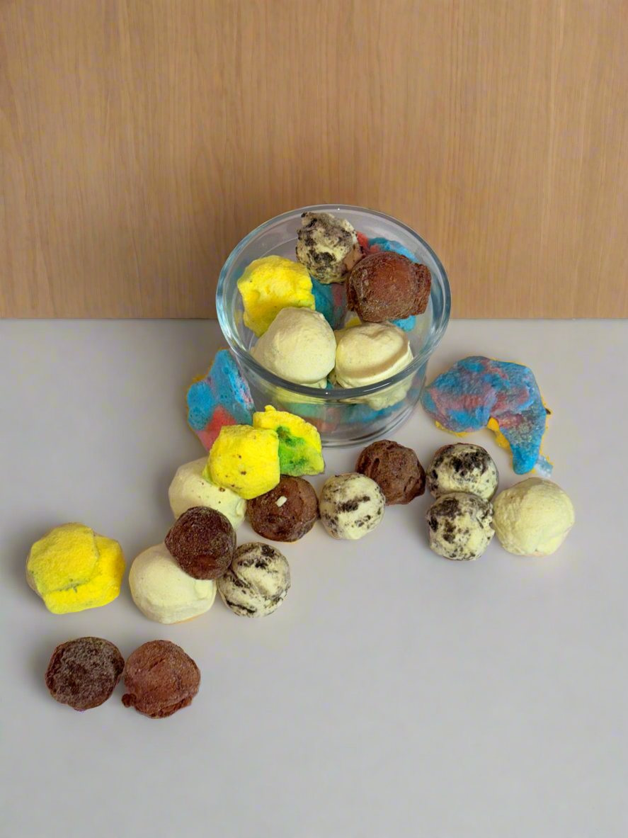 Freeze-dried gelato transformed into light, crunchy bites with rich, creamy flavor. Available in multiple flavors. No frying. No added preservatives.